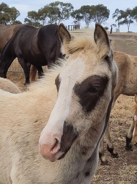 Here is one born at Chalani this year, a pale white palomino, whose goggles are chocolate. She is still a palomino. The extra dark colouring is thought to be from milk protein, as they usually don’t darken up that colour permanently. Palominos are particularly sensitive to changes in protein levels, and will often be different shades each season